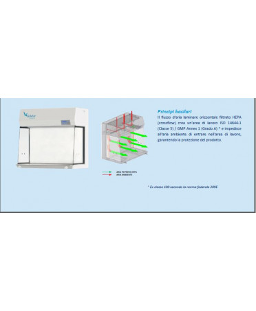 - I sistemi orizzontali a flusso laminare consentono il funzionamento in condizioni sterili e prive di particelle grazie allo scarico continuo dell'area di lavoro mediante un flusso d'aria ultra filtrato orizzontale unidirezionale. La pressione positiva all'interno dell'armadio impedisce l'afflusso di aria ambiente dall'ambiente circostante nell'area di lavoro.